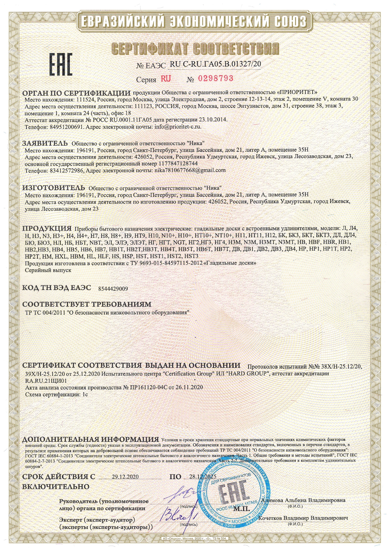 ÒÑ RU C-RU.ÃÀ05.Â.01327/20 äî 28/12/2025