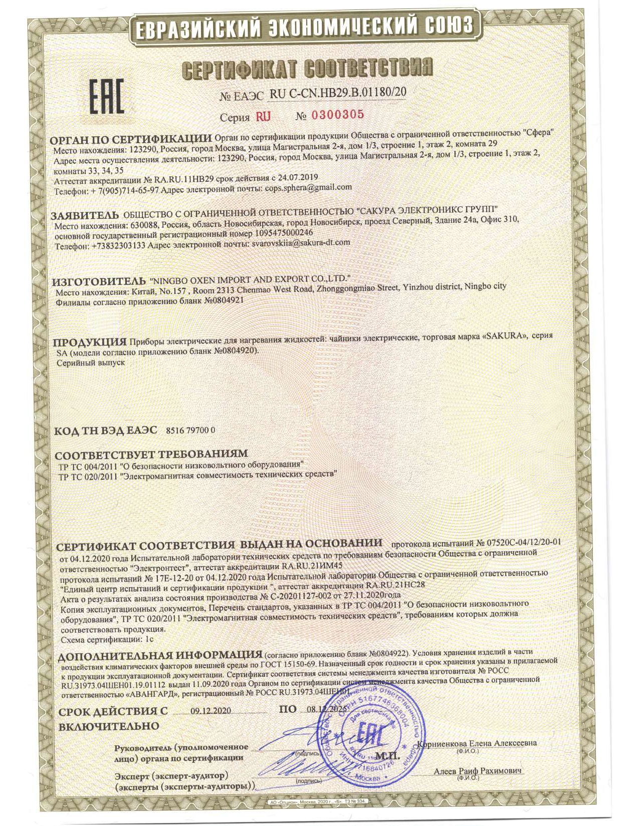 ÅÀÝÑ RU C-CN.HB29.B.01180/20 äî 08/12/2025