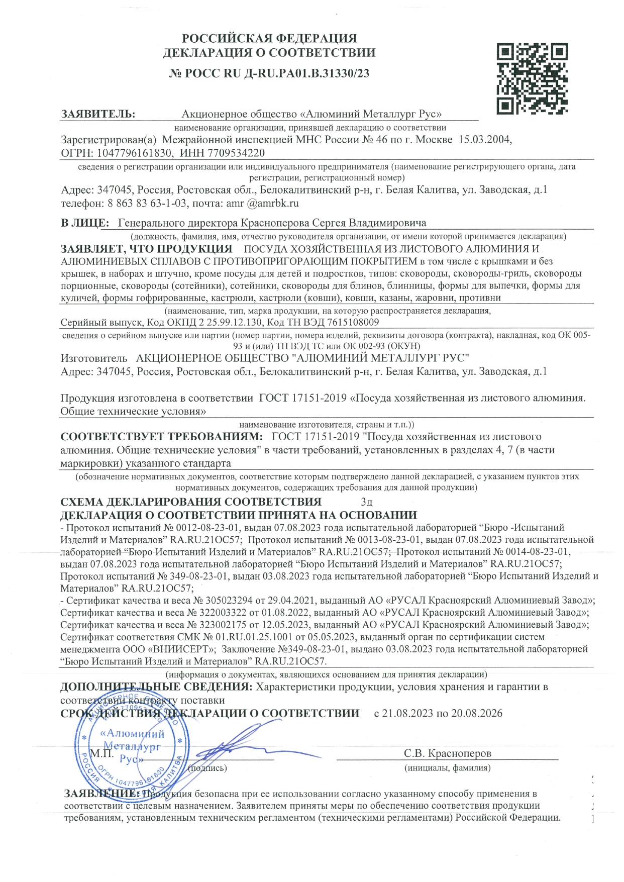 ÐÎÑÑ RU Ä-RU.ÐA01.B.31330/23 äî 20/08/2026