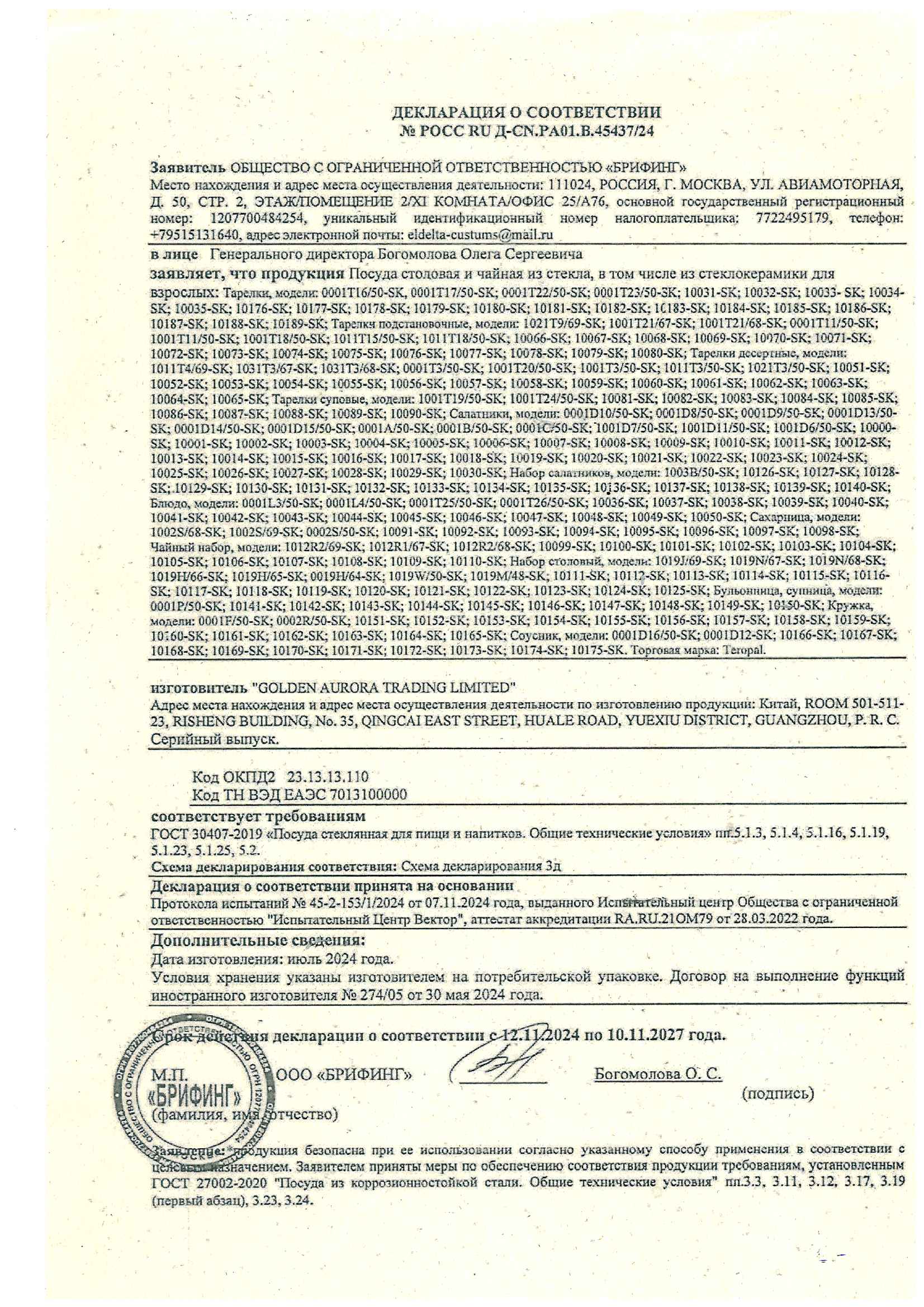 ÐÎÑÑ RU Ä-CN.ÐÀ01.Â.45437/24 äî 10/11/2027