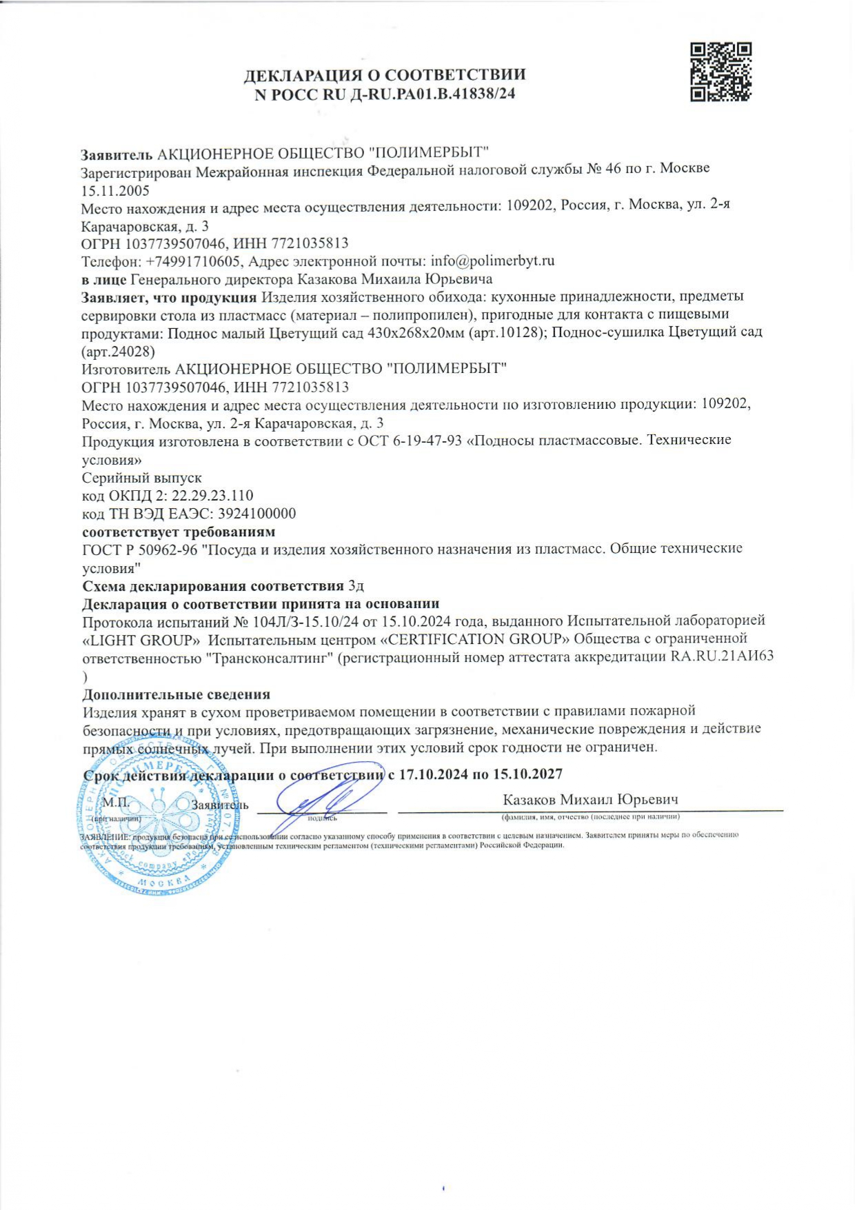 POCC RU A-RU.PA01.B.41838/24 äî 15/10/2027