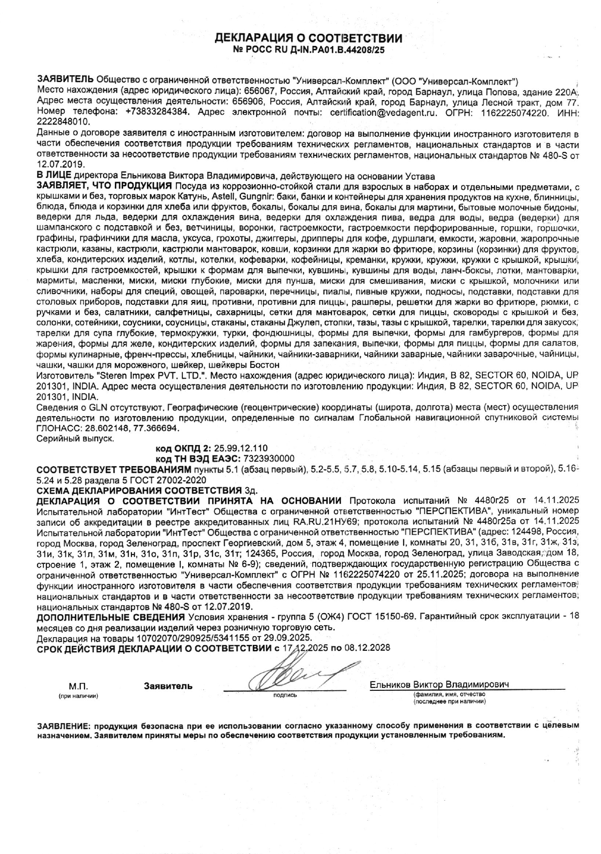 Óíèâåðñàëüíîå âåäðî èç íåðæàâåþùåé ñòàëè îò ÒÌ \"Êàòóíü\" âûïîëíåíî èç âûñîêîêà÷åñòâåííûõ ìàòåðèàëîâ, áëàãîäàðÿ ÷åìó íå ïîäâåðãíåòñÿ êîððîçèè è ïðîñëóæèò íè îäèí ãîä. Ìåðíàÿ øêàëà ïîìîæåò îïðåäåëèòü òî÷íîå êîëè÷åñòâî æèäêîñòè èëè ñûïó÷èõ ïðîäóêòîâ. Óêîìïëåêòîâàíî êðûøêîé è ïðî÷íîé óäîáíîé ðó÷êîé. Îáú¸ì 15 ë. Äèàìåòð äíà 21 ñì.