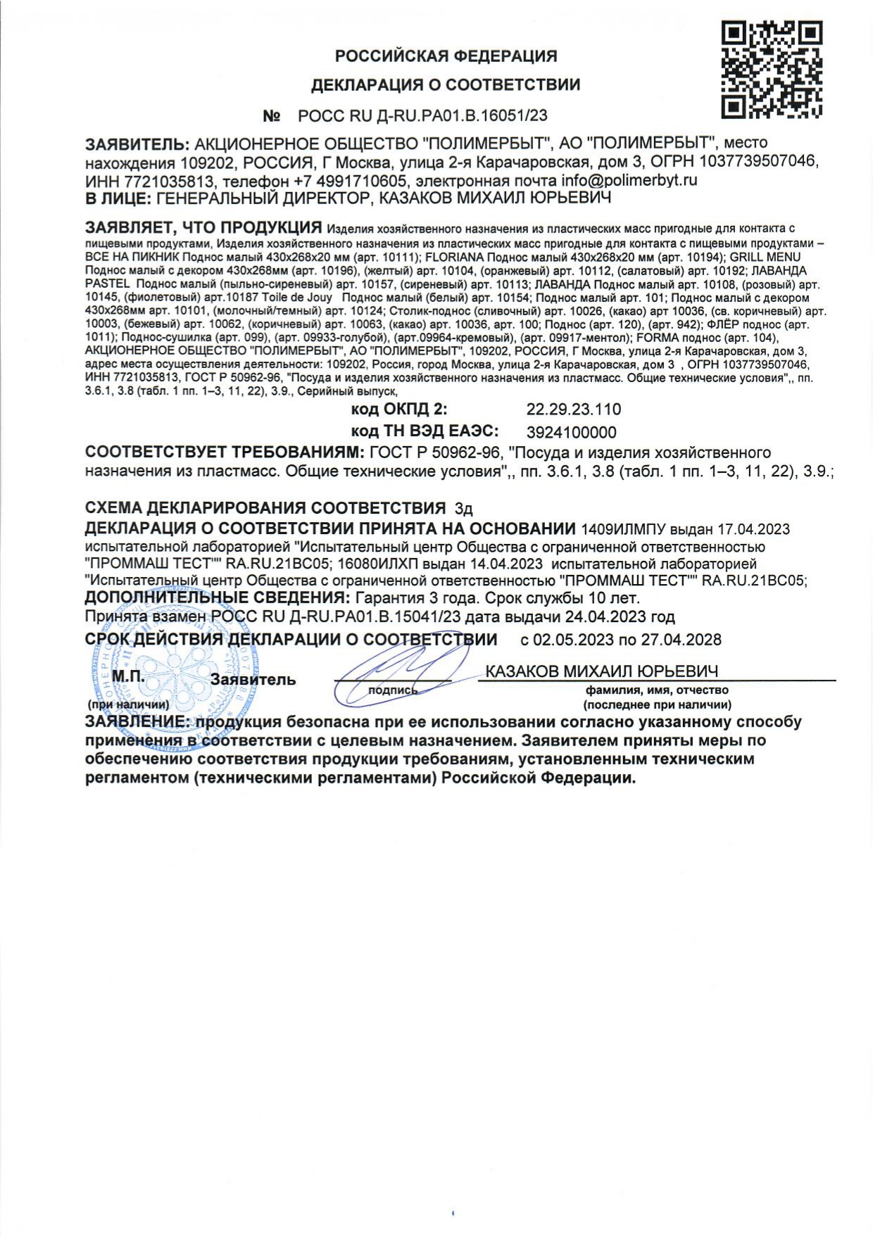 ÐÎÑÑ RU Ä-RU.ÐÀ01.Â.16051/23 äî 27/04/2028