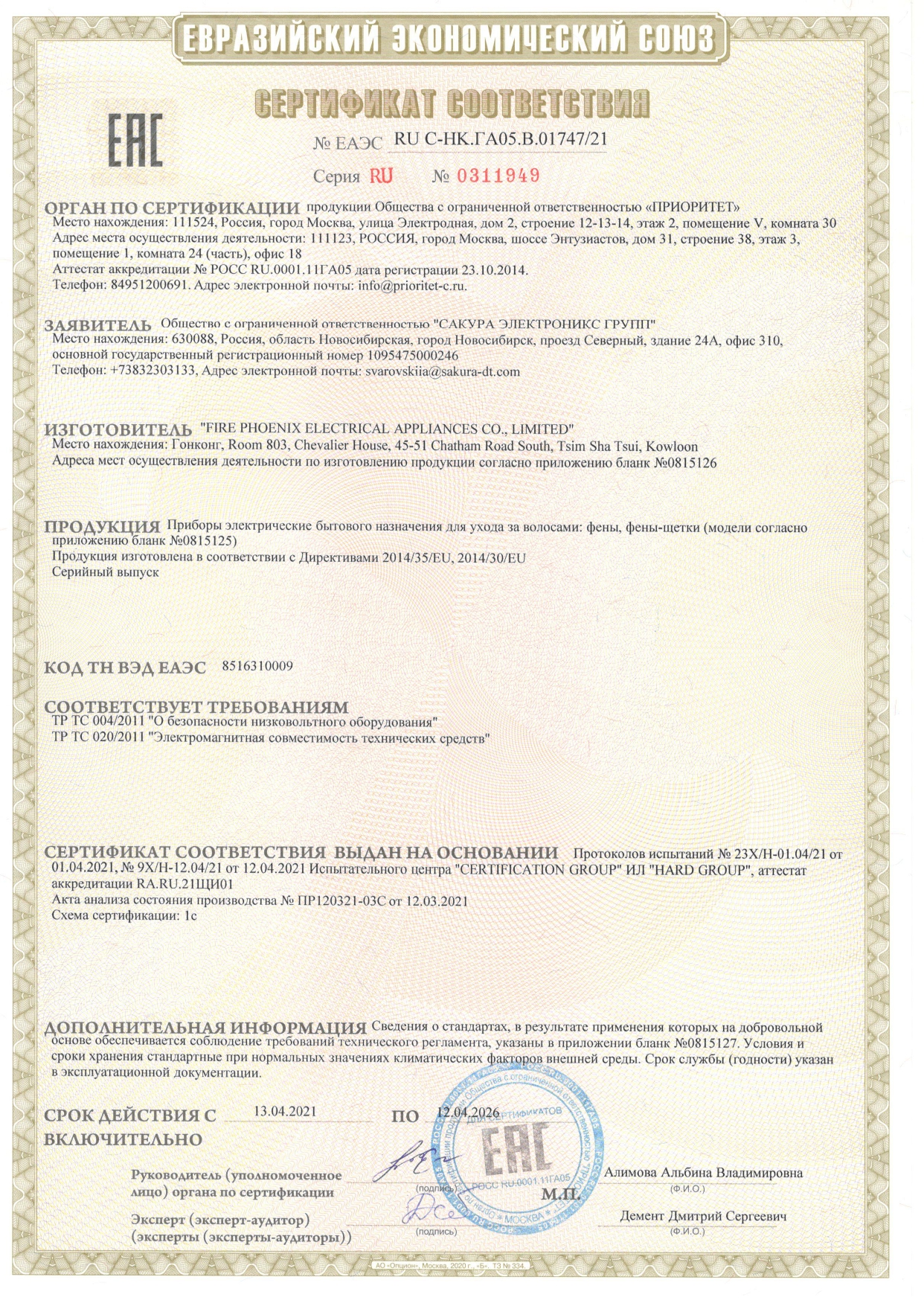 ÅÀÝÑ RU C-HK.ÃÀ05.Â.01747/21 äî 12/04/2026