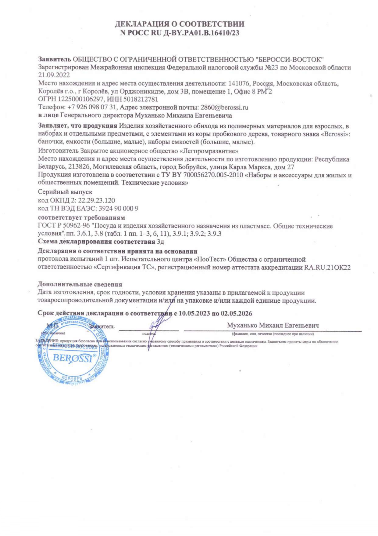 ÐÎÑÑ RU Ä-BY.ÐÀ01.Â.16410/23 äî 02/05/2026