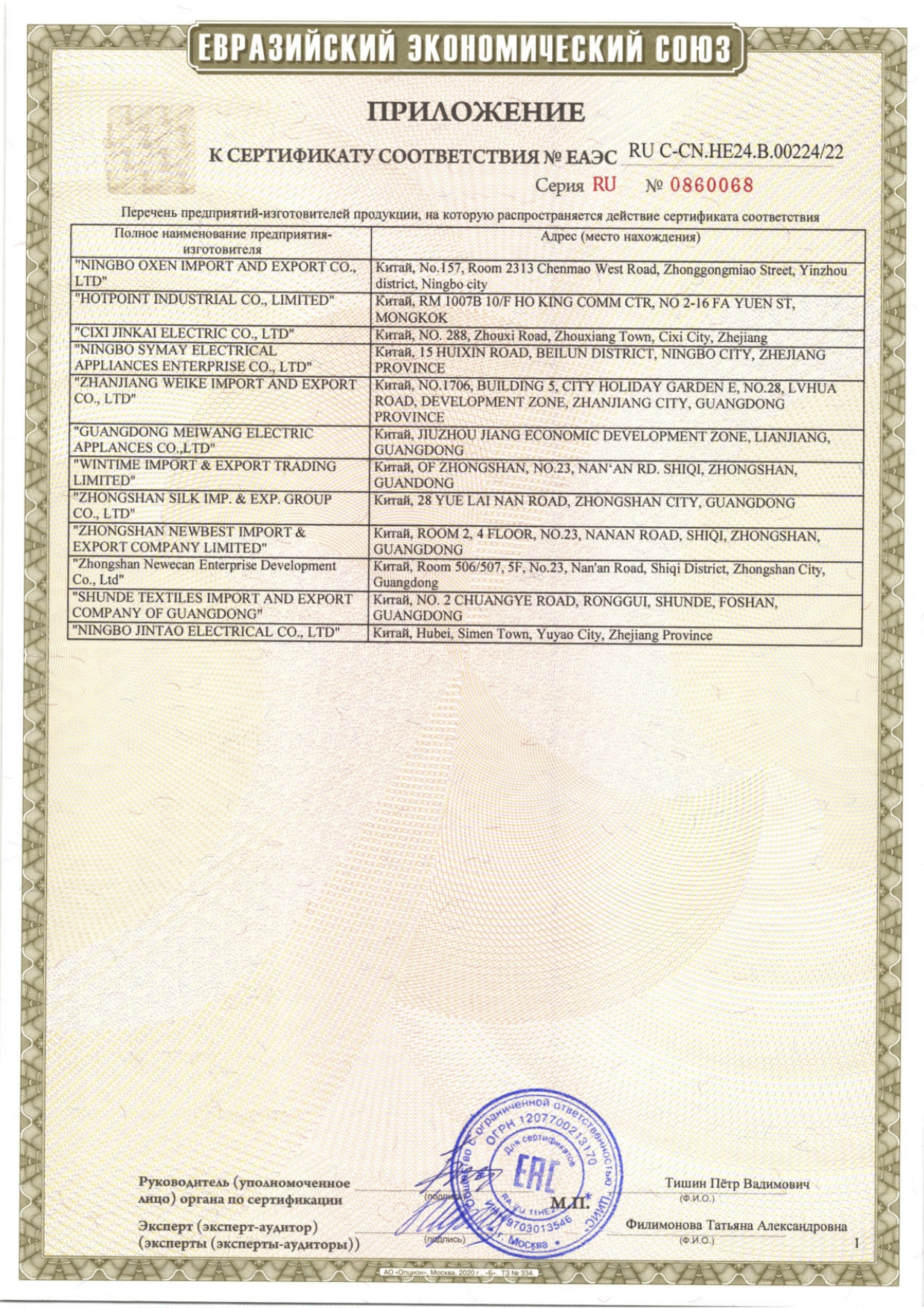 ÅÀÝÑ RU C-CN.HE24.B.00224/22 äî 20/06/2027