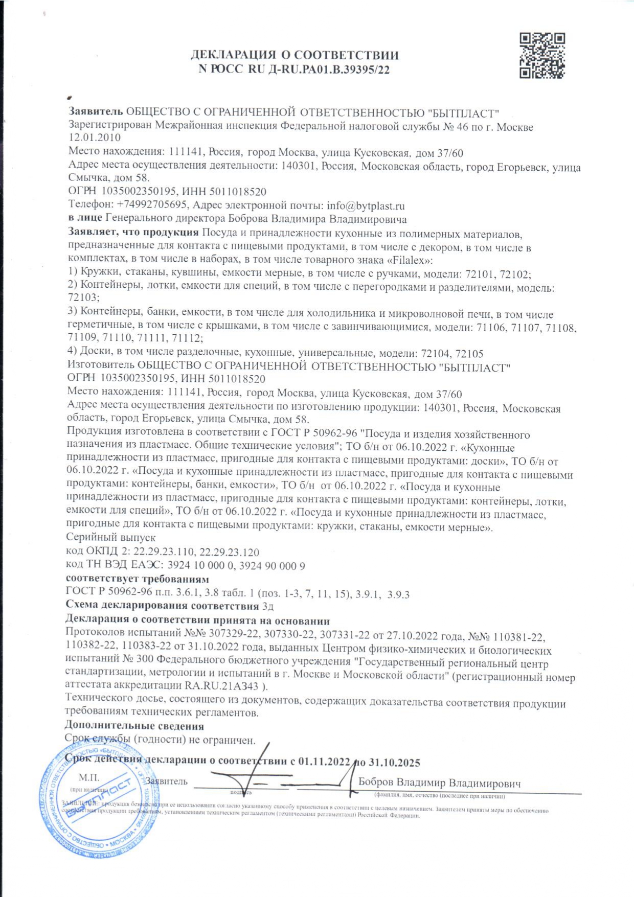 ÐÎÑÑ RU Ä-RU.PA01.B.39395/22 äî 31/10/2025