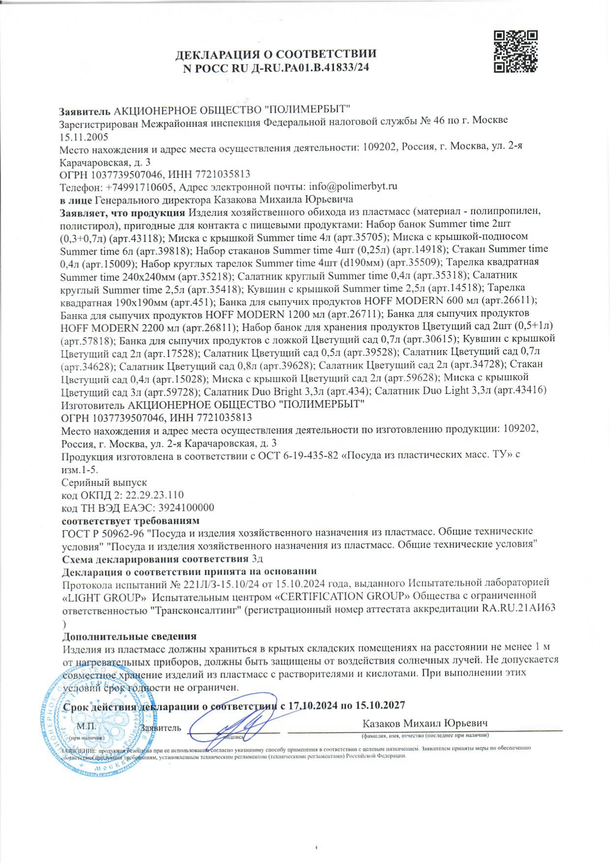 POCC RU A-RU.PA01.B.41833/24 äî 15/10/2027