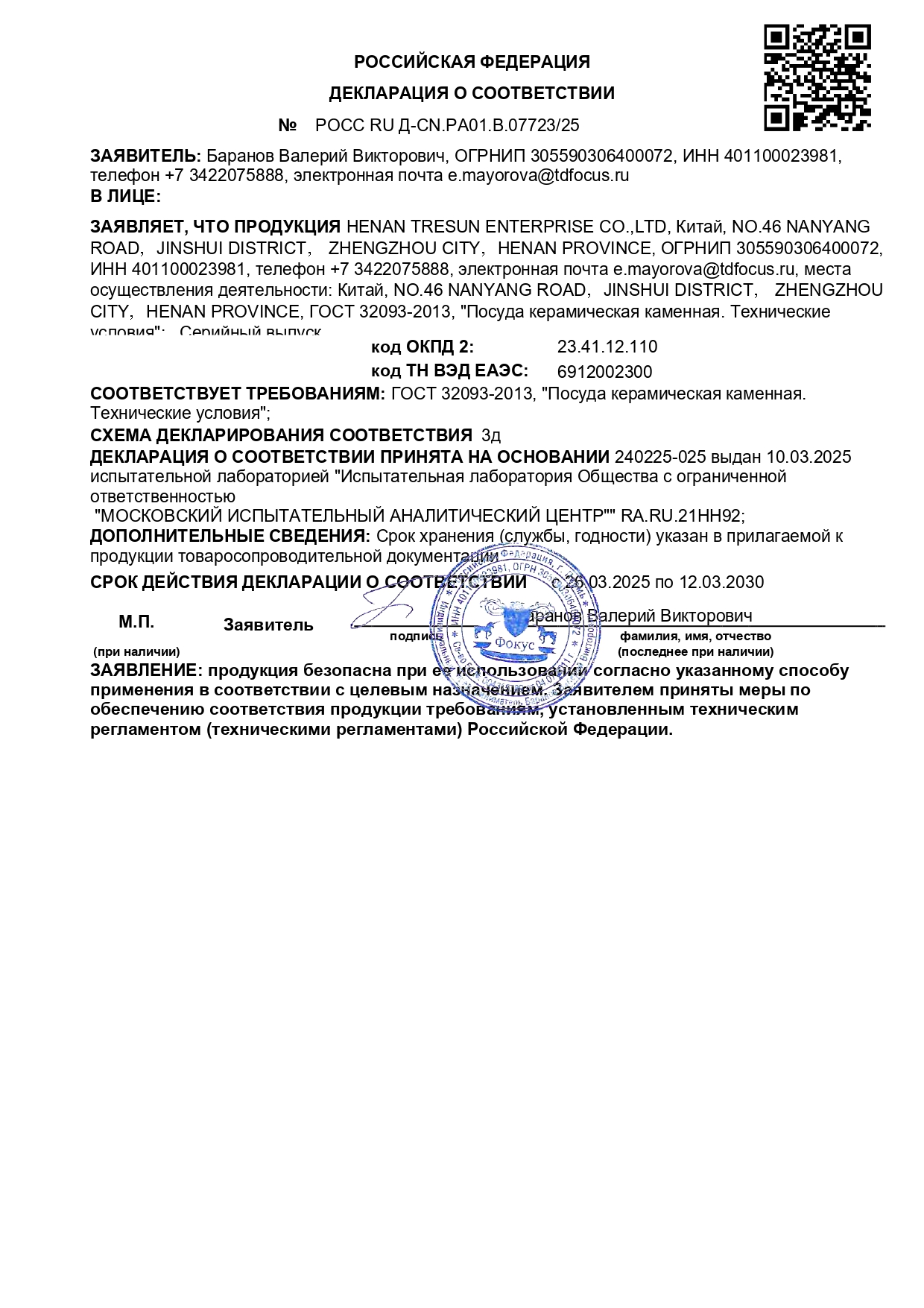 ÐÎÑÑ RU Ä-CN.ÐÀ01.Â.07723/25 äî 12/03/2030