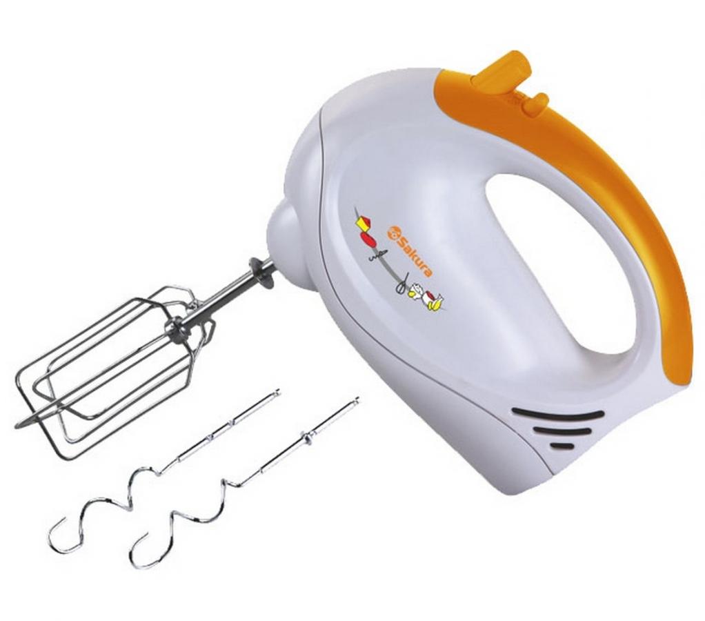 Ìèêñåð SA-6311A 175 Âò, ðó÷íîé, 5 ñêîðîñòåé ðàáîòû, ïëàñòèê.êîðïóñ, íàñàäêè èç íåðæ.ñòàëè (âåí÷èêè äëÿ âçáèâàíèÿ, êðþêè äëÿ çàìåøèâàíèÿ òåñòà), áåëûé ñ îðàíæåâûì