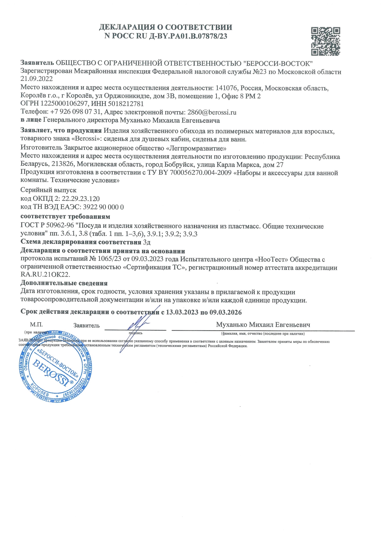 ÐÎÑÑ RU Ä-BY.PÀ01.Â.07878/23 äî 09/03/2026